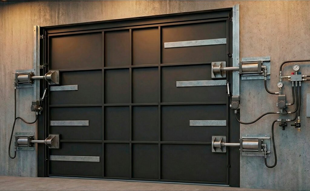 Neste sistema, a abertura e o fechamento do portão são realizados diretamente por cilindros hidráulicos, projetados para suportar alto esforço mecânico e uso intensivo.